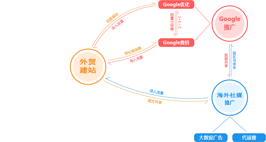 广州外贸推广公司为您提供全面的“整合”方案,为您的企业提供全生命周期的精细化服务和咨询。为此,我们搭建了从广告投放到SEO优化,从内容运营到网站开发,从品牌策划到电商运营的近100人的团队,组成了一家集全球渠道资源、人才资源、技术资源为一体的数字营销机构,为您一站式解决出海难题,实现品牌全球推广!